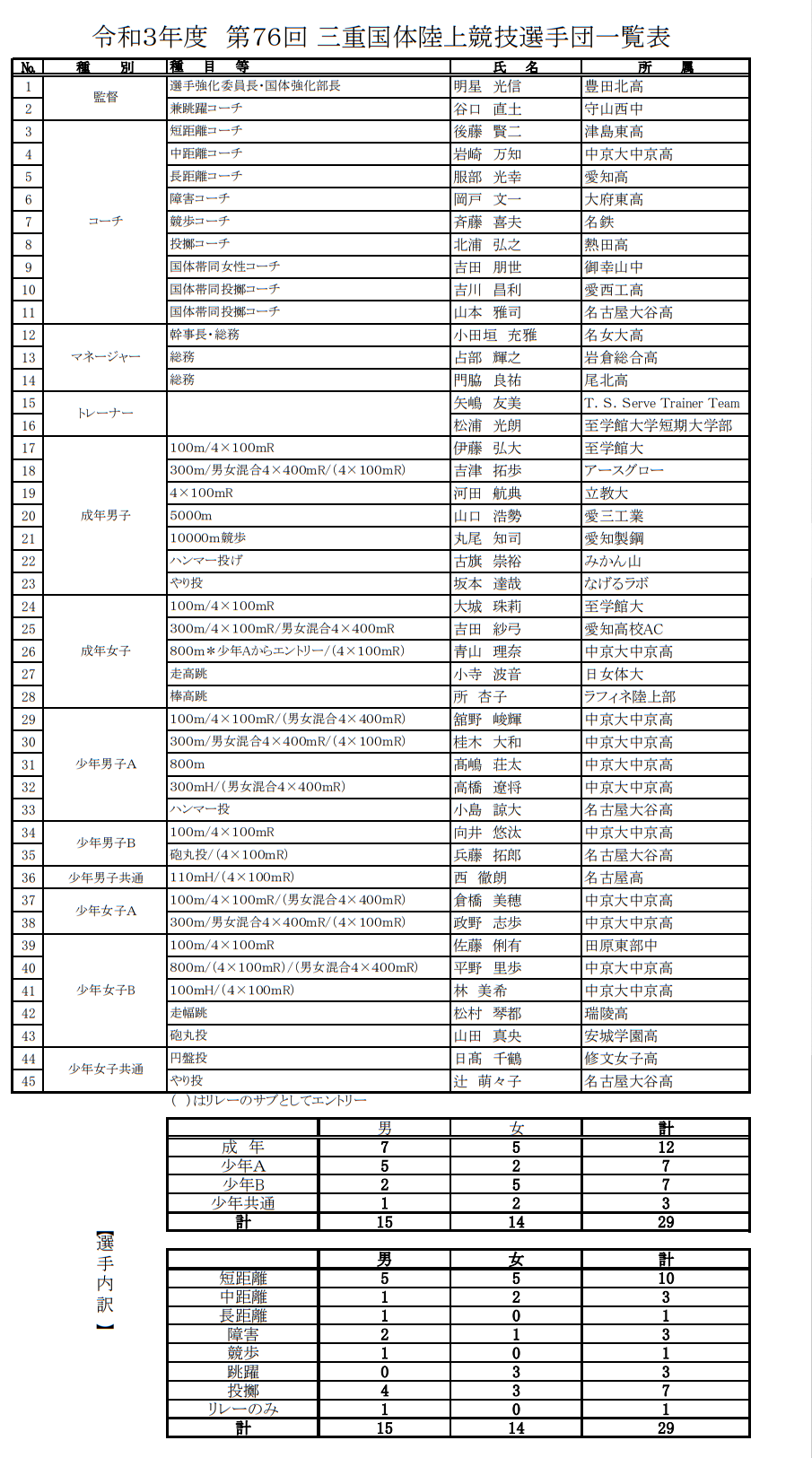 令和3年度 第76回三重国体陸上競技選手団一覧表(R3.8.11)