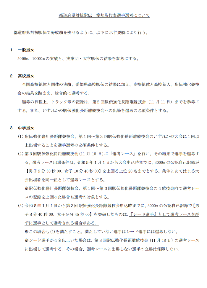 都道府県対抗駅伝 愛知県代表選手選考について R5.5.24(水)